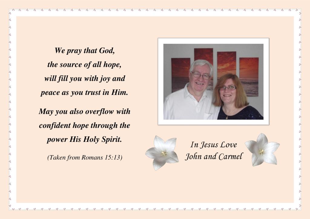 My husband John and I lead an online ministry of hope and encouragement, inspired by the Bible verse Isaiah 58:11 carlled GARDENLAND MINISTRIES. I have written several books, which are all available on Amazon worldwide. To see excepts from the books freely, please see the ‘HOME’ tab below; for more information please see the ‘BOOKS AND LINKS’ and ‘ABOUT THE AUTHOR’ tabs.