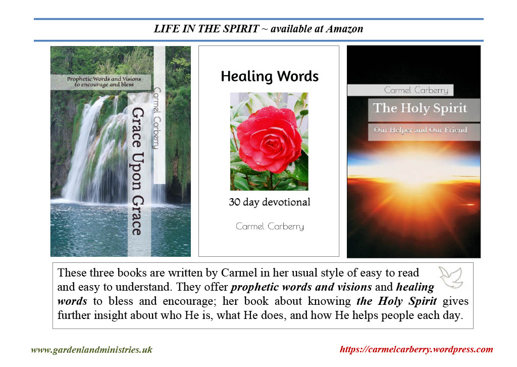 I hope you enjoy the book extracts which are freely shared on this site to encourage and bless. The MENU side bar gives more information about all of the books, with links to Amazon to buy if desired. I have felt led to write in a simple way which is easy to read and understand, with the heart to share God’s Love and Grace which is open to all people everywhere through His Son. In Jesus Love, Carmel Carberry.